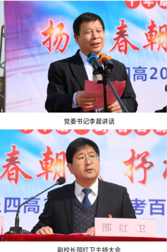 李晨回顾了市四高辉煌的历史和传统,并向同学们提出几点希望。一要坚定理想信念。每位同学都有自己的理想,没有人希望自己碌碌无为度过一生。十年寒窗,百炼成钢,最大的动力是我们对实现理想的渴望,强大的理想信念是支撑最后一百天学习时光的强大力量。二要坚持不懈努力。“行百里者半九十”,最后一程往往是最艰苦的,正是由于这异常艰苦才具有决胜的意义。我们坚信,坚持到底就是胜利,因为,历史往往在最后一刻改写,人生常常在关键时刻铸就。三要坚决付诸行动。大家一定要分秒必争,奋战百天。不要怕吃苦,因为学习的苦比起生活的苦,根本不算什么;不要贪玩,因为蹉跎了岁月,也蹉跎了你的人生;不要懒惰,因为懒惰会控制你的生活,消耗你的青春。