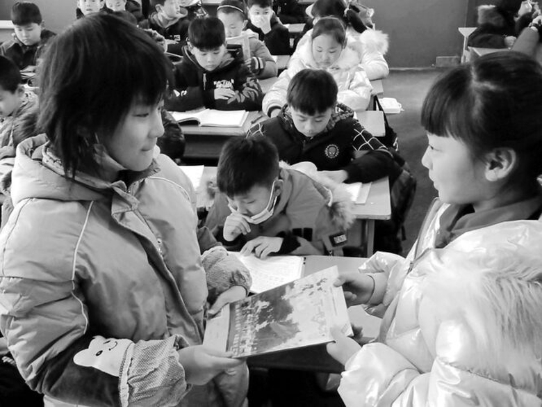 2月28日开学第一天,穆宇映同学(右一)把春节期间爱心人士赠送给她的励志图书带到学校与小伙伴们共享。穆宇映同学是邓州市穰东镇实验小学优秀少先队员、南阳市“2020年度新时代好少年”获得者,她不但是一个刻苦学习成绩优异的好少年,而且还是一位乐于奉献、持续践行雷锋精神的好学生。 高 峰 席清铎 摄