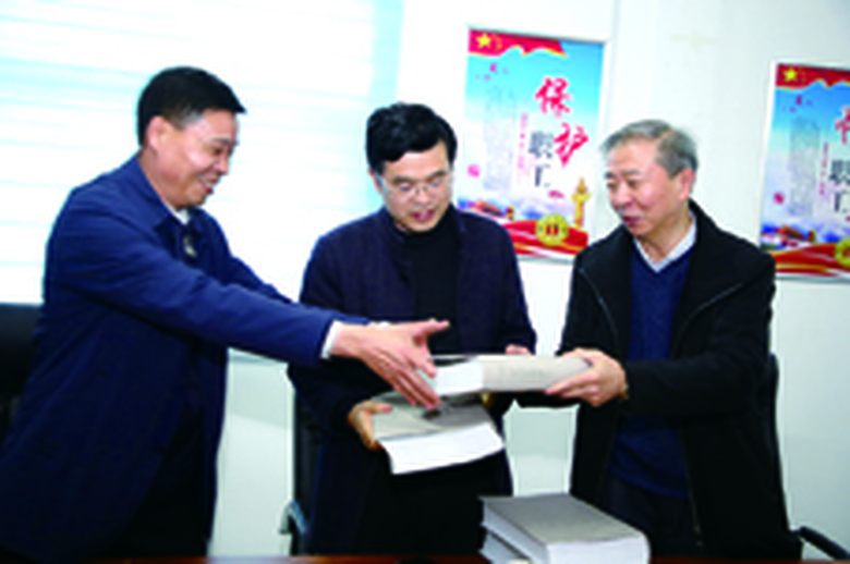 康源春(右)向舞阳县农业农村局捐赠食用菌专业图书。