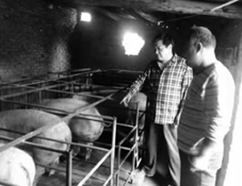 宋献曾(右)对巩义市政北山口镇养殖户许根上进行养殖技术指导。(资料图片)