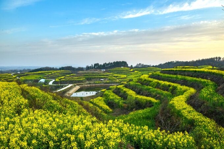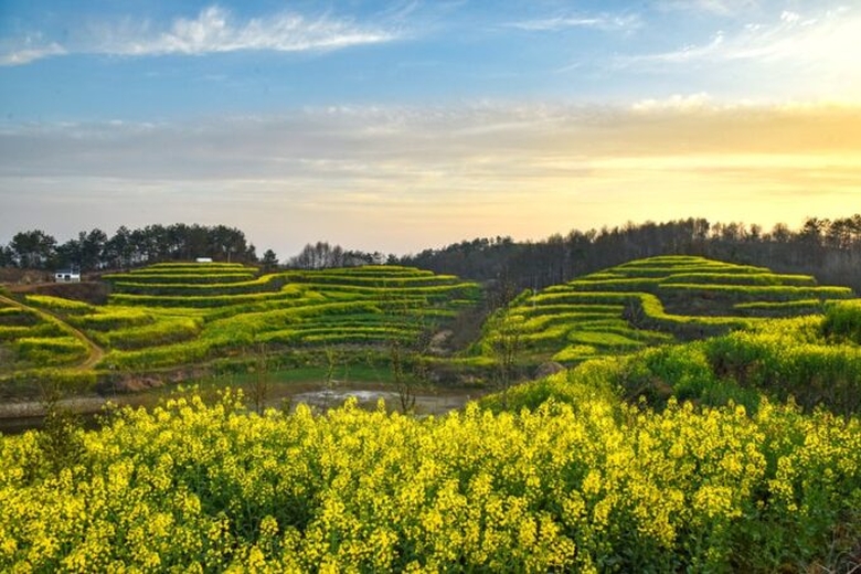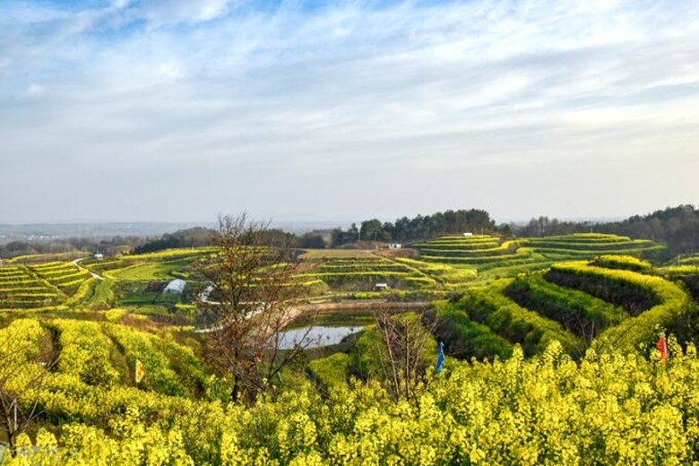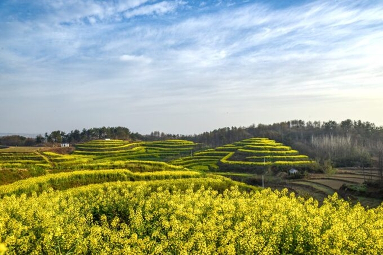 郑州3月13日 惊蛰过后,万物复苏。位于大别山腹地的革命老区河南新县,千亩油菜花盛开,放眼望去,梯田宛如金黄色“地毯”。