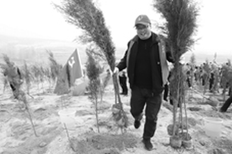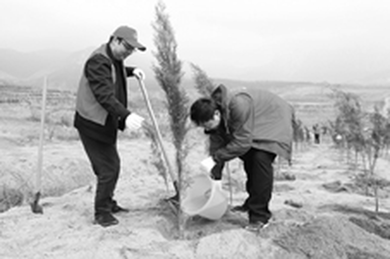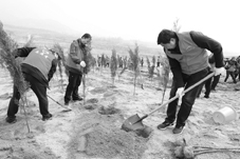 省知识产权局机关干部和义务植树志愿者团结互助为建设生态城市增添了一片生机勃勃的绿色。