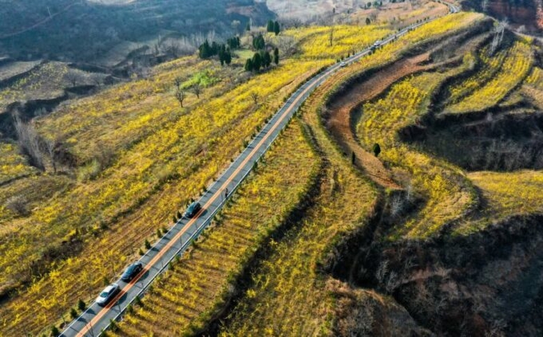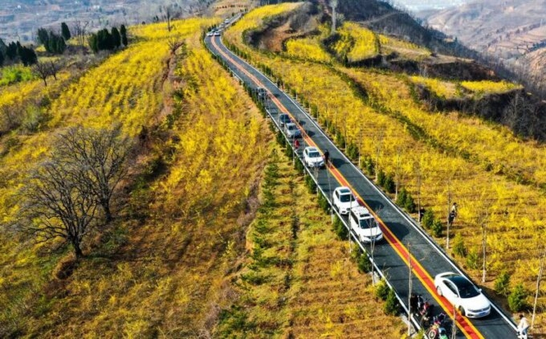 3月15日,在河南省卢氏县文峪乡望家山,一条“彩虹”路直上云端,穿越望家山万亩果药产业扶贫基地。群山之巅,连翘花盛开,千山染金,暗香浮动,蔚为壮观。众多市民驱车行驶在金色连翘花海之中,恍若置身空中花园,美不胜收。