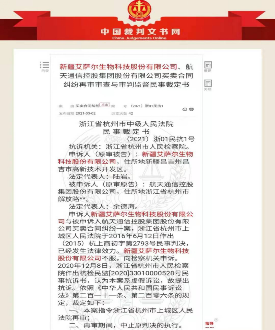 3月2日,浙江省杭州市中级人民法院在中国裁判文书网发布(2021)浙01民抗1号《民事裁定书》,申诉人新疆艾萨尔生物科技股份有限公司与被申诉人航天通信控股集团股份有限公司买卖合同纠纷一案,浙江省杭州市上城区人民法院于2016年6月12日作出(2015)杭上商初字第2793号民事判决,已经发生法律效力。浙江省杭州市人民检察院作出杭检民监【2020】33010000528号民事抗诉书,认为本案系虚假诉讼,故提出抗诉。杭州市中级人民法院作出了指令浙江省杭州市上城区人民法院再审;再审期间,中止原判决的执行。通过检法两家司法机关的共同努力,这起虚假买卖合同纠纷案被成功纠正。