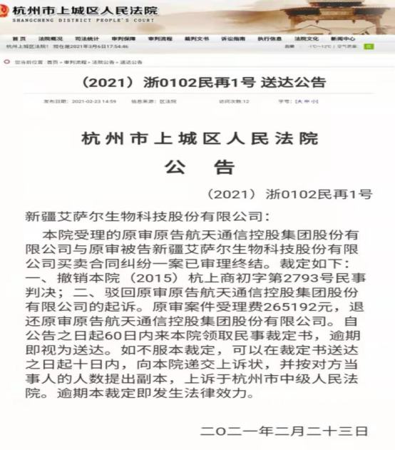 杭州市中级人民法院于2021年1月15日作出的(2021)浙01民抗1号《民事裁定书》,指令杭州市上城区人民法院再审。上城区人民法院接到再审指令后,对(2015)杭上商初字第2793号民事案件进行了再审,作出了撤销该院(2015)杭上初字第2793号民事判决、驳回原审原告航天通信控股集团股份有限公司的起诉的裁定,并于2021年2月23日在该院官网上发布了一份向新疆艾萨尔生物科技股份有限公司送达公告(2021)浙012民再1号的公告。