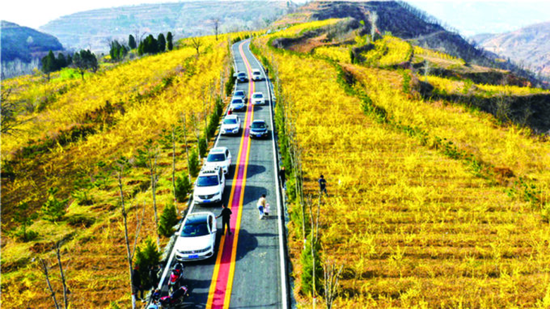 时下,道路两旁连翘花开成海,满目金黄,吸引不少市民驱车前往,行驶在金色连翘花海之中,恍若置身空中花园。