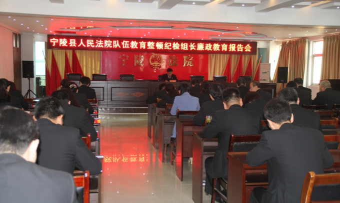按照宁陵县人民法院政法队伍教育整顿工作领导小组安排,3月25日,宁陵县法院召开县纪委监委派驻县法院纪检组长廉政教育报告会,纪检监察组组长杨德兴以题为“加强队伍建设 做忠诚干净担当政法干警”,为全院干警作廉政教育报告。