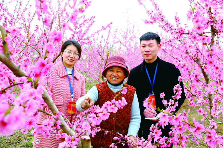 3月24日,风和日丽,中国宁陵第五届桃花节在宁陵县乔楼乡辘轳湾桃园景区内开幕。宁陵县乔楼乡的千亩桃花次第开放,吸引了大量周边游客前来赏花游玩,成为当地生态旅游又一盛景。图为游客在桃花园里赏花、拍照。 吴春雷 摄