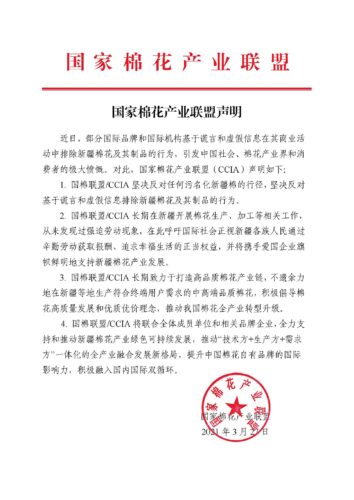 国家棉花产业联盟声明指出,坚决反对任何污名化新疆棉花的行径,坚决反对某些国际品牌、机构基于谎言和虚假信息在其供应链和日常业务中排除新疆棉花及其制品的行为;联盟咯呼吁国际社会正视新疆各族人民辛勤劳动获取报酬、追求幸福生活的正当权益,并将携手爱国企业旗帜鲜明地支持新疆棉花产业发展;联盟致力于打造高品质棉花产业链,不遗余力地在新疆等地生产符合终端需求的中高端品质棉花,积极倡导棉花高质量发展和优质优价理念,致力于推动我国棉花全产业转型升级;联盟将联合全体成员单位和相关品牌企业,推动“技术方+生产方+需求方”一体化的全产业融合新格局,提升中国自有品牌的国际影响力,积极融入国内国际双循环。