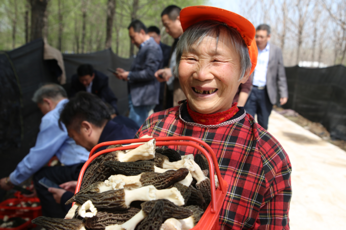 图为杨庄镇林下种植的羊肚菌惹人喜爱。瞧,这位老人手捧刚采摘的羊肚菌喜笑颜开。