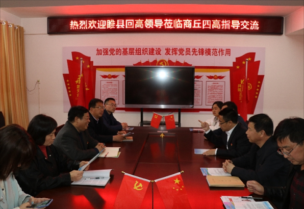 3月30日下午,睢县回高校长张广中一行来商丘市四高学习交流。商丘市四高党委书记李晨、校长苗军,副校长邵红卫等热情接待了张广中一行,并陪同参观了校园文化建设及日语班教室。