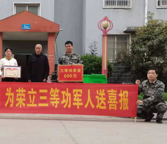 3月30日下午,正阳县真阳街道办事处工作人员来到辖区现役军人郑卫波的家中,将郑卫波同志所获三等功喜报及600元奖金送到他父亲的手中,并向他们致以诚挚的祝贺。