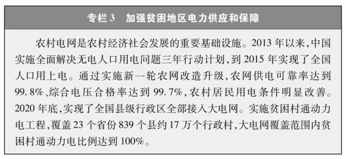 基础设施显著改善。出行难、用电难、用水难、通信难,是长期以来制约贫困地区发展的瓶颈。把基础设施建设作为脱贫攻坚基础工程,集中力量,加大投入,全力推进,补齐了贫困地区基础设施短板,推动了贫困地区经济社会快速发展。以建好、管好、护好、运营好农村公路(简称“四好农村路”,专栏2)为牵引,积极推进贫困地区建设外通内联、通村畅乡、客车到村、安全便捷的交通运输网络。截至2020年底,全国贫困地区新改建公路110万公里、新增铁路里程3.5万公里,贫困地区具备条件的乡镇和建制村全部通硬化路、通客车、通邮路,贫困地区因路而兴、因路而富。努力改善贫困地区水利基础设施条件,2016年以来,新增和改善农田有效灌溉面积8029万亩,新增供水能力181亿立方米,水利支撑贫困地区发展的能力显著增强。大幅提升贫困地区用电条件,实施无电地区电力建设、农村电网改造升级、骨干电网和输电通道建设等电网专项工程,把电网延伸到更多偏远地区,农村地区基本实现稳定可靠的供电服务全覆盖,供电能力和服务水平明显提升(专栏3)。加强贫困地区通信设施建设,贫困村通光纤和4G比例均超过98%,远程教育加快向贫困地区学校推进,远程医疗、电子商务覆盖所有贫困县,贫困地区信息化建设实现跨越式发展。基础设施的极大改善,从根本上破解了贫困地区脱贫致富的难题,畅通了贫困地区与外界的人流、物流、知识流、信息流,为贫困地区发展提供了有力的硬件支撑。