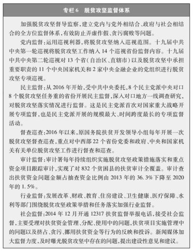 脱贫攻坚涉及面广、要素繁多、极其复杂,需要强有力的组织领导和贯彻执行。充分发挥党的政治优势、组织优势,建立中央统筹、省负总责、市县抓落实的脱贫攻坚管理体制和片为重点、工作到村、扶贫到户的工作机制,构建起横向到边、纵向到底的工作体系。各级党委充分发挥总揽全局、协调各方的作用,执行脱贫攻坚一把手负责制,中西部22个省份党政主要负责同志向中央签署责任书、立下军令状,省市县乡村五级书记一起抓。脱贫攻坚期内,贫困县党委政府正职保持稳定。有脱贫任务的地区,倒排工期、落实责任,抓紧施工、强力推进。脱贫攻坚任务重的地区,把脱贫攻坚作为头等大事和第一民生工程,以脱贫攻坚统揽经济社会发展全局。实行最严格的考核评估和监督检查,组织脱贫攻坚专项巡视,开展扶贫领域腐败和作风问题专项治理(专栏5),加强脱贫攻坚督导和监察(专栏6),确保扶贫工作务实、脱贫过程扎实、脱贫结果真实,使脱贫攻坚成果经得起实践和历史检验。建立健全干部担当作为的激励和保护机制,加大关心关爱干部力度,树立正确用人导向,引导广大干部在决胜脱贫攻坚中奋发有为、履职尽责。加强基层扶贫队伍建设,普遍建立干部驻村帮扶工作队制度,按照因村派人、精准选派的原则,选派政治素质好、工作能力强、作风实的干部驻村扶贫。广大驻村干部牢记使命、不负重托,心系贫困群众,扎根基层扶贫一线,倾心倾力帮助贫困群众找出路、谋发展、早脱贫。从2013年开始向贫困村选派第一书记和驻村工作队,到2015年,实现每个贫困村都有驻村工作队、每个贫困户都有帮扶责任人。截至2020年底,全国累计选派25.5万个驻村工作队、300多万名第一书记和驻村干部,同近200万名乡镇干部和数百万村干部一道奋战在扶贫一线。
