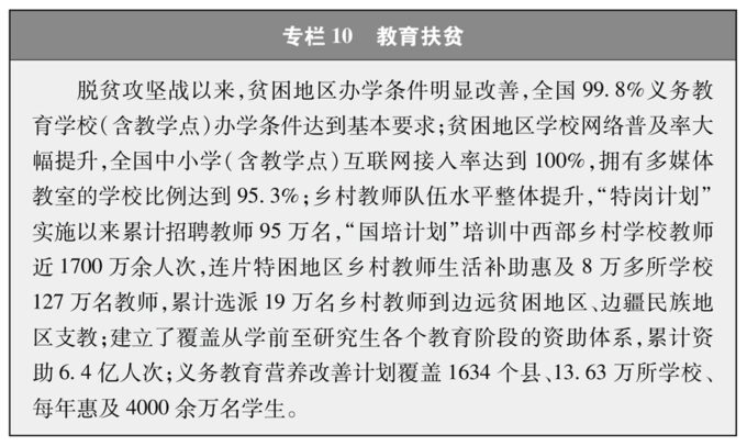 发展教育脱贫一批。坚持再穷不能穷教育、再穷不能穷孩子,加强教育扶贫,不让孩子输在起跑线上,努力让每个孩子都有人生出彩的机会,阻断贫困代际传递(专栏10)。持续提升贫困地区学校、学位、师资、资助等保障能力,20多万名义务教育阶段的贫困家庭辍学学生全部返校就读,全面实现适龄少年儿童义务教育有保障。实施定向招生、学生就业、职教脱贫等倾斜政策,帮助800多万贫困家庭初高中毕业生接受职业教育培训、514万名贫困家庭学生接受高等教育,重点高校定向招收农村和贫困地区学生70多万人,拓宽贫困学生纵向流动渠道。开展民族地区农村教师和青壮年农牧民国家通用语言文字培训,累计培训350万余人次,提升民族地区贫困人口就业能力。“学前学会普通话”行动先后在四川省凉山彝族自治州和乐山市马边彝族自治县、峨边彝族自治县、金口河区开展试点,覆盖43万学龄前儿童,帮助他们学会普通话。