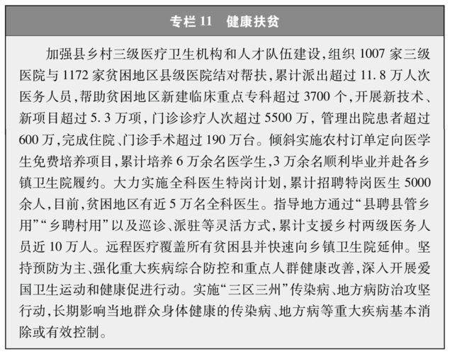 中国还结合实际、因地制宜,采取其他多渠道多元化扶贫措施。大力推进就业扶贫,通过免费开展职业技能培训、东西部扶贫协作劳务输出、扶贫车间和扶贫龙头企业吸纳、返乡创业带动、扶贫公益性岗位安置等形式,支持有劳动能力的贫困人口在本地或外出务工、创业,贫困劳动力务工规模从2015年的1227万人增加到2020年的3243万人。开展健康扶贫工程,把健康扶贫作为脱贫攻坚重要举措,防止因病致贫返贫(专栏11)。深入实施网络扶贫工程,支持贫困地区特别是“三区三州”等深度贫困地区,完善网络覆盖,推进“互联网+”扶贫模式。实施资产收益扶贫,把中央财政专项扶贫资金和其他涉农资金投入设施农业、光伏、乡村旅游等项目形成的资产,折股量化到贫困村,推动产业发展,增加群众收入,破解村集体经济收入难题。2020年新冠肺炎疫情发生后,中国采取一系列应对疫情的帮扶举措,加大就业稳岗力度,开展消费扶贫行动,有效克服了新冠肺炎疫情影响。