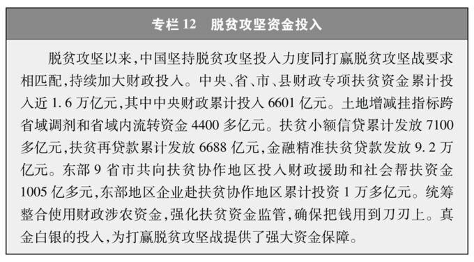 贫困地区发展条件差,贫困人口自我发展能力弱,消除贫困仅仅依靠个体、区域、民间等力量远远不够,必须作为执政党和国家的责任,上升为国家意志、国家战略、国家行动。中国共产党始终把消除贫困作为定国安邦的重要任务,制定实施一个时期党的路线方针政策、提出国家中长期发展规划建议,都把减贫作为重要内容,从国家层面部署,运用国家力量推进。几代中国共产党人,锚定一个目标,一茬接着一茬干。中共十八大以来,中国共产党把脱贫攻坚摆在治国理政的突出位置,加强党的集中统一领导,统筹谋划、强力推进。从党的领袖到广大党员干部,情系贫困群众、心怀减贫大业,全党目标一致、上下同心。加强顶层设计和战略规划,制定印发《关于打赢脱贫攻坚战的决定》《关于打赢脱贫攻坚战三年行动的指导意见》等政策文件,明确目标、路径和具体措施并一以贯之抓下去。各级财政不断加大投入力度(图4),构建多元资金投入体系(专栏12),为减贫事业发展提供资金保障。发挥社会主义制度集中力量办大事的优势,广泛动员各方力量积极参与。建立脱贫攻坚责任体系、政策体系、组织体系、投入体系、动员体系、监督体系、考核评估体系等制度体系,为脱贫攻坚顺利推进提供了有力支撑。