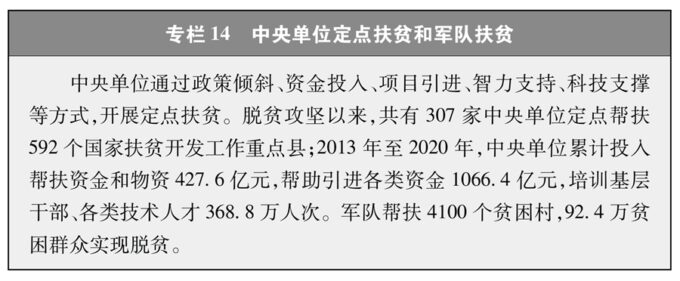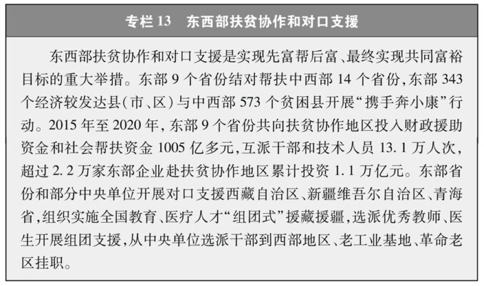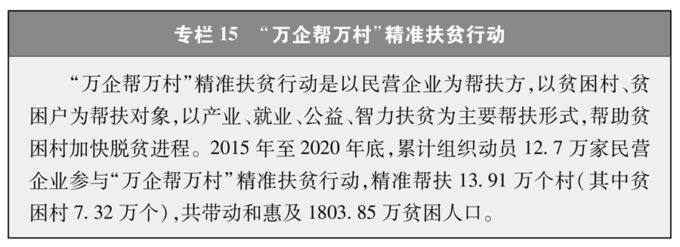 扶贫减贫是艰巨复杂的系统工程,需要调动各方积极参与。为打赢脱贫攻坚战,中国共产党依托严密组织体系和高效运行机制,广泛有效动员和凝聚各方力量,构建政府、社会、市场协同推进,专项扶贫、行业扶贫、社会扶贫互为补充的大扶贫格局,形成跨地区、跨部门、跨单位、全社会共同参与的多元主体的社会扶贫体系。加强东西部扶贫协作和对口支援(专栏13),推动省市县各层面帮扶,促进人才、资金、技术向贫困地区流动,实现优势互补,缩小区域差距。积极开展定点扶贫,组织各级党政机关、人民团体、国有企事业单位和军队帮扶贫困县或贫困村(专栏14)。各民主党派、工商联和无党派人士充分发挥各自优势,为打赢脱贫攻坚战献智献力。积极推动各行各业发挥专业优势,开展产业扶贫、科技扶贫、教育扶贫、文化扶贫、健康扶贫、消费扶贫。广泛动员民营企业参与扶贫开发,引导市场开发能力强的主体进入资源开发潜力大的地区,实现互惠互利、共同发展(专栏15)。广泛动员社会组织、公民个人积极参与脱贫攻坚,开展扶贫公益活动。设立国家扶贫日,建立脱贫攻坚国家荣誉制度,表彰脱贫攻坚先进典型,营造了人人愿为、人人可为、人人能为的社会帮扶氛围。