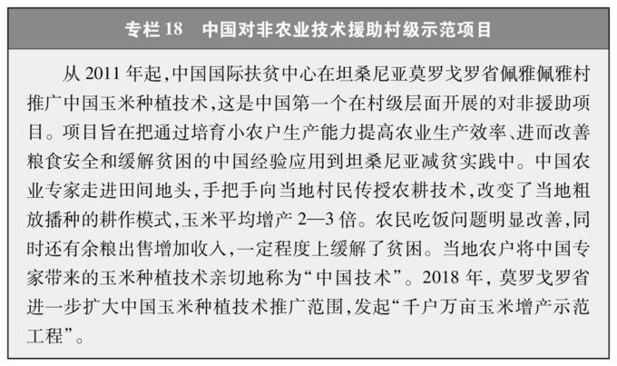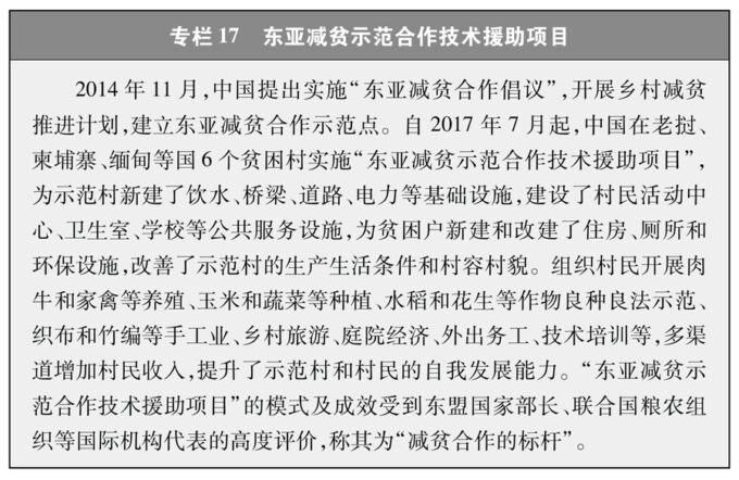 实施惠及民生的国际减贫合作项目。在亚洲地区,中国与东盟国家共同开展乡村减贫推进计划,在老挝、柬埔寨、缅甸三国乡村基层社区实施“东亚减贫示范合作技术援助项目”(专栏17)。在非洲地区,中国为非洲国家援建水利基础设施、职业技术学校、社会保障住房等设施,打造农业合作示范区,推进实施中非菌草技术合作、中非友好医院建设、非洲疾控中心总部建设等项目(专栏18)。在南太平洋地区,中国推动落实对太平洋岛国无偿援助、优惠贷款等举措,开展基础设施建设和农业、医疗等技术合作援助项目。在拉美地区,援建农业技术示范中心,帮助受援国当地民众摆脱贫困。中国还与联合国教科文组织合作设立国际农村教育研究与培训中心等机构,面向非洲、东南亚等国家实施农村教育转型、教师培训等项目。