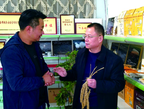 郭亚培向本报社社长李志民(右)介绍富硒食品“五谷杂粮”。