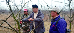 郭亚培(中)为果农传授果树剪枝技术。