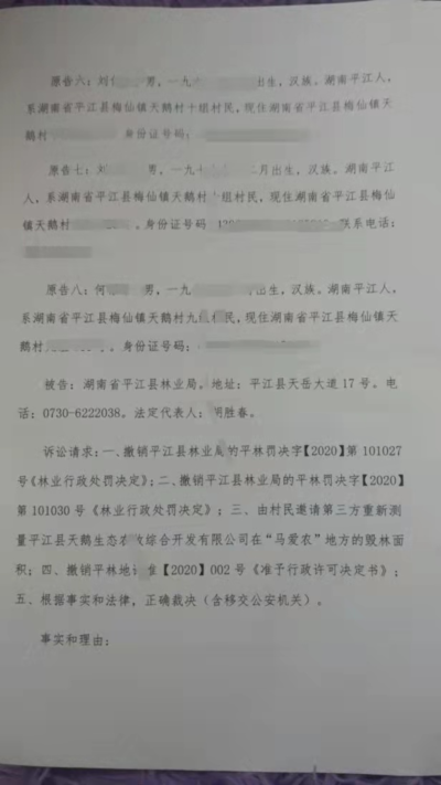我们了解到,目前八农民状告平江县林业局造假、不作为一案,已在岳阳市屈原管理区人民法院立案(案号【2021】湘0691行初40号),近期将择日开庭。