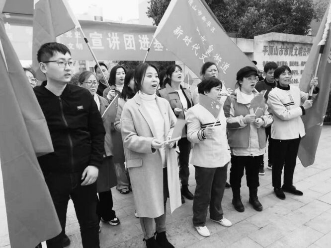 “没有共产党就没有新中国,没有共产党就没有新中国,共产党辛劳为民族,共产党她一心救中国……”3月29日上午,在平顶山市新华区的园林路社区,在该市科协党组成员、副主席李国军的带领下,平顶山市科协广大党员干部和园林路社区的党员、居民们一起开展学党史、唱红歌活动。嘹亮悦耳的歌声、悠扬熟悉的旋律,仿佛把大家带到了那段激情燃烧的岁月。活动现场,党员们佩戴着鲜亮的党徽,高举鲜艳的党旗,重温入党誓词。