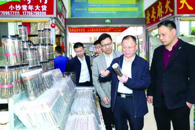 本报社社长李志民(右二)、安徽鹤年堂总经理黄浩(右三)等在亳州中药材专业市场调研。