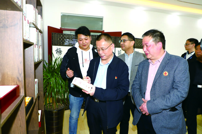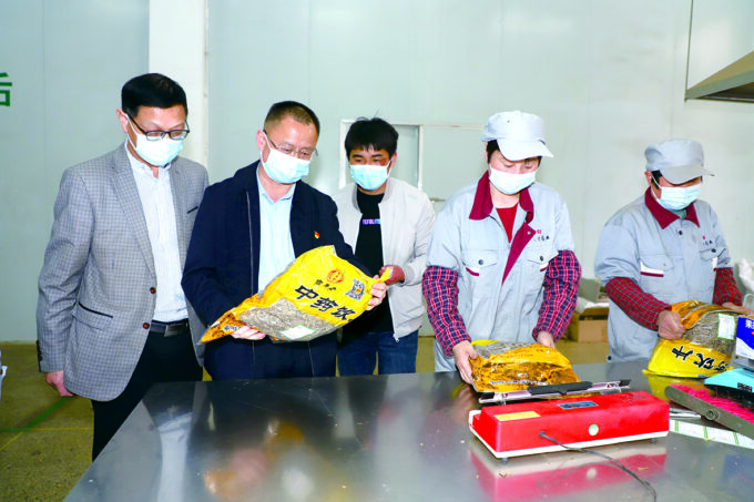 本报社社长李志民(前左二)在安徽鹤年堂总经理黄浩(前左一)陪同下在安徽鹤年堂成品包装车间考察。