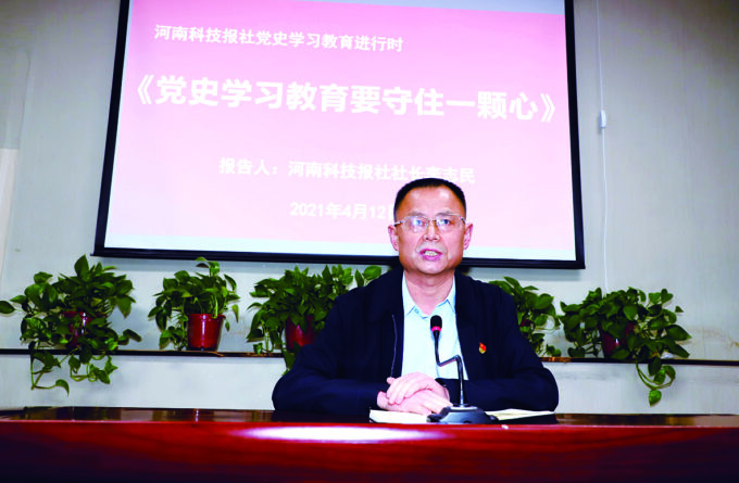 4月12日,河南科技报社召开党史学习教育专题会。河南科技报社社长李志民以《党史学习教育要守住一颗心》为题作专题授课,并对报社党史学习教育进行动员部署。