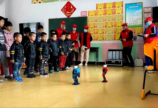 瞧,两个小机器人讲起文明礼仪、左右摇摆跳起欢快的舞蹈,遥控飞机在运动场上空飞上飞下,悬空停留,孩子们瞪大了眼睛,数学、力学模型孩子们亲手操作,让福利院的孩子们进一步增强了求知探索的兴趣。
