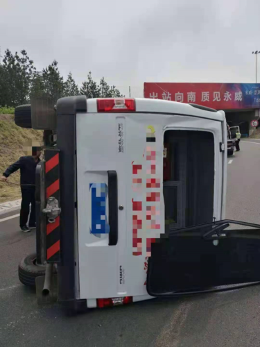 4月13日11时,在京港澳高速703公里北向南方向转双鹤湖收费站匝道内,一辆江铃面包车发生了侧翻事故。所幸车上人员都系了安全带,事故没有造成人员受伤。