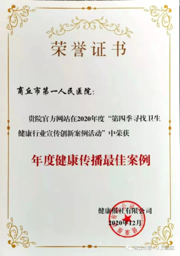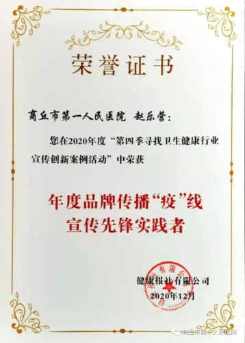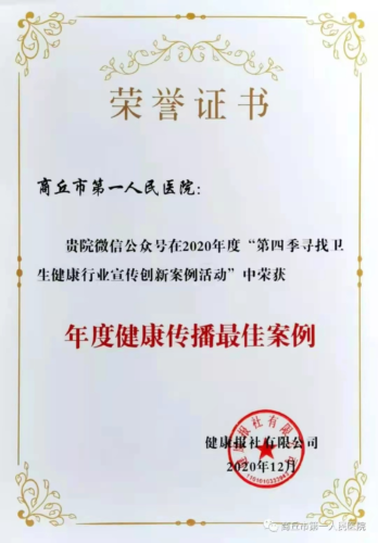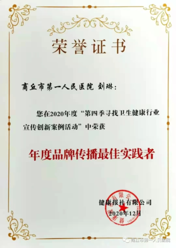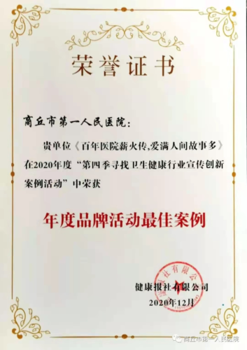 会议发布了2020年度“第四季寻找卫生健康行业宣传创新案例活动”各奖项获奖名单。我院官方网站获评官方网站类年度健康传播最佳案例奖,官方微信获评微信平台类年度健康传播最隹案例奖,“百年医院 爱满人间--听我们讲商丘市第一人民医院的故事”(以下简称“讲述医院故事”)获评年度品牌活动最隹案例奖,党委委员赵乐营获评年度品牌传播“疫”线宣传先锋实践者,妇委会主任刘琳获评年度品牌传播最佳实践者,在会上受到隆重表彰。
