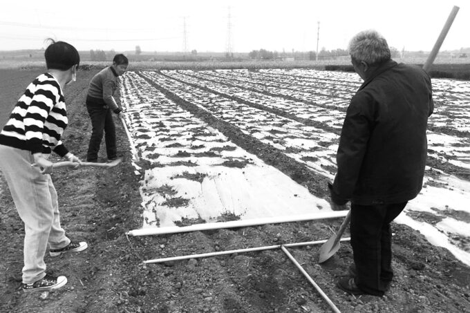 近年来,安阳市积极推广一年两熟豫谷18谷子种植技术,全年谷子亩产600多公斤,产值3600多元。图为4月18日,在安阳市龙安区马投涧镇高白塔村,安阳市合成农民种植专业合作社社员正在为刚播下的豫谷18谷子覆盖地膜。 毕兴世 摄