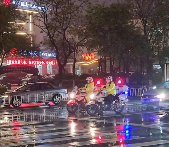 2021年4月21日,商丘市区迎来了一场春雨,让路面显得异常湿滑,加上夜晚能见度降低,致使车辆通行缓慢,群众出行受影响,商丘交警铁骑大队结合市区交通特点,启动雨雪天气紧急预案,加强警力投入,延长高峰岗执勤时间。迎着春雨,铁骑队员巡逻在市区主干道和易堵塞的路口,全力守护城市道路平安,预防夜晚发生交通拥堵,同时,队员在市区道路上警灯闪烁,通过喊话的方式提醒违停车辆遵守交通规则,为商丘市民安全出行保驾护航。(田保庆通讯员张建超 余方义)