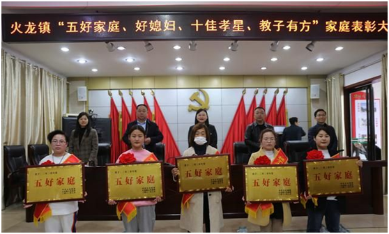 该镇授予王欣等35名同志火龙镇“五好家庭”“好媳妇”“十佳孝星”“教子(女)有方”家庭荣誉称号。先进典型们依次上台领取奖牌和奖品,“五好家庭”代表王欣、“好媳妇”代表田丽霞、“十佳孝星”代表孙军红、“教子(女)有方”李玉妮分别作典型发言,平凡而感人的事迹引来现场的阵阵掌声。