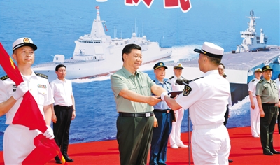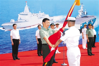 4月23日,海军三型主战舰艇——长征18号艇、大连舰、海南舰在海南三亚某军港集中交接入列。中共中央总书记、国家主席、中央军委主席习近平出席交接入列活动并登上舰艇视察。这是习近平向海南舰授予军旗、命名证书。