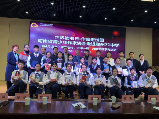 日前,为了深入贯彻落实党中央国务院“倡导全民阅读,建设书香社会”的伟大号召,在广大青少年中进一步搞好多读书、读好书活动,“世界读书日”之际,河南省青少年作家协会邀请郑州市作家协会副主席魏清海,河南省散文学会副秘书长孙勇,郑州市文联委员、少林寺《禅露》杂志执行主编邹相,中国盲协文学委员会委员、北京市写作学会理事王苏华,河南省阅读学会经典推广中心主任苏小蒙,郑州市老艺术家协会理事、原《商都艺苑》编辑贾延,以及省会青年作家魏灵芝、张弛等,在河南省青少年作家协会常务副主席兼秘书长梦情、校园文学工作委员会主任孔令欣的带领下来到郑州71中学,开展“作家进校园”活动,为该校300多名师生分享自身的写作技巧与读书心得、开展互动问答,并捐赠了作家们出版的图书。