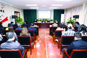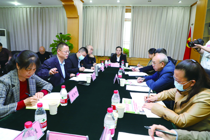 在调研座谈会上,李志民社长(左前二)向李明清处长(右前二)一行介绍本报社媒体转型工作。