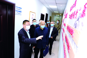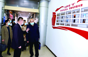 李志民社长(前左)向李明清处长(前右)一行介绍本报社党建墙。
