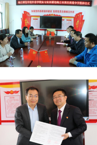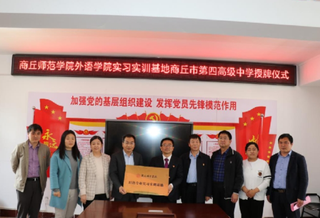 4月28日上午10时,商丘市第四高级中学在行政楼二楼会议室举行商丘师范学院外语实训基地授牌仪式,商丘师范学院外语学院院长周运增、副书记张彤、副院长孙艳玲、日语系主任张玉昕参加了仪式,院长周运增向商丘市第四高级中学校长苗军授牌,四高党委书记李晨、副校长邵红卫等班子成员参加了仪式。