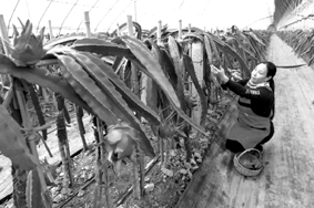 近日,山东省广饶县大王镇后贾村鋆源家庭农场员工在采摘已经成熟的优质火龙果。目前,该农场建有全自动高标准火龙果种植大棚2个,引进“软枝大红”“金都一号”等新品种,年产量达1.5万公斤;同时探索蟠桃、黄桃、香梨等多品种水果种植,年产量达5万公斤。下一步,该农场计划丰富种植品种、扩大种植规模,真正实现“南果北种”,着力打造集旅游观光休闲采摘于一体的现代化特色家庭农场。 张建堂 摄