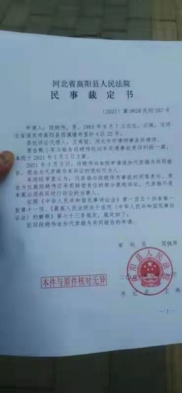 据了解,该案中的原告在诉讼中仅有一个被告,就是段晓伟。就此,段晓伟向高阳县人民法院递交了追加代某雄和保险公司为被告的申请。