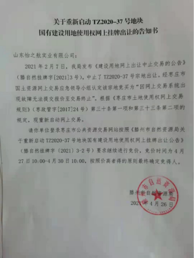 4月26日,滕州资源局给怡之航公司发出《关于重新启动TZ2020-37号地块国有建设用地使用权网上挂牌出让的告知书》,陈述2月7日发布的《建设用地网上出让中止交易的公告》中止TZ2020-37号宗地出让的理由,是“经枣庄市国土资源网上交易应急领导小组认定该宗地竟买为’因网上交易系统出现故障无法提交报价至交易终止’。根据《枣庄市土地使用权网上交易规则》(枣政管字[2017]24号)第三十条第一项和第三十三条第二项的规定,现重新启动网上交易。”4月27日,滕州资源局将TZ2020-37号宗地在交易中心网上重新挂牌拍卖,起止时间为2021年4月27日10:00—2021年4月30日10:00,规则设定还是原来两家公司符合竟买条件。怡之航公司拒绝参加二次竟买,4月30日,TZ2020-37号宗地自然被另一家公司低价拍得。