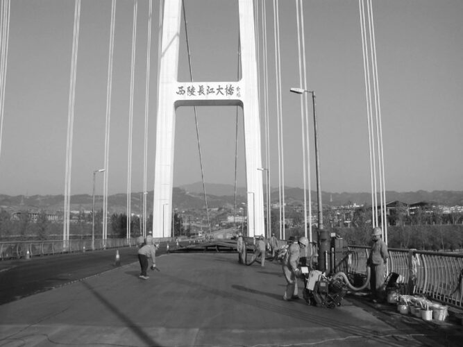 工人们在长江三峡西陵大桥上喷环保防腐涂料。(资料图片)