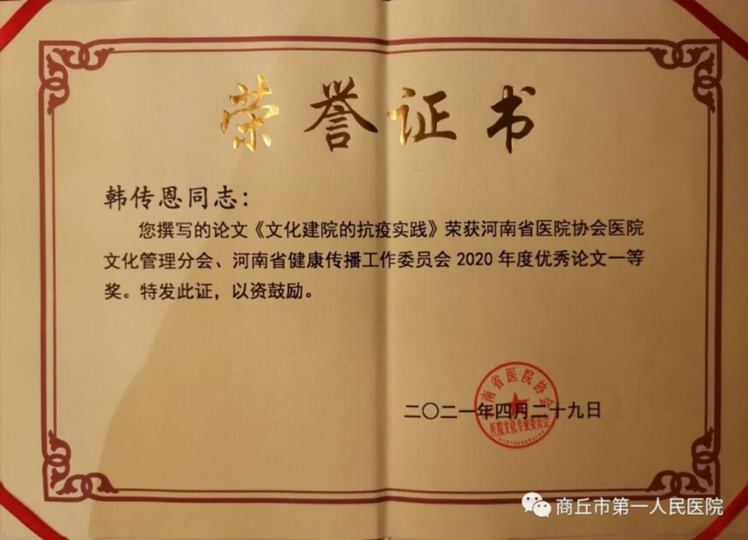 会议表彰了2020年度河南省医院文化和健康宣传优秀作品和优秀个人。韩传恩撰写的《文化建院的抗疫实践》荣获2020年度优秀论文一等奖,急诊门诊护士长韩雪迎撰写的《白衣执甲 无悔初心》被评为2020年度“抗疫群英谱”优秀人文故事十佳作品。