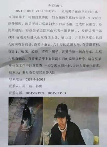 2021年5月8日7点40分,台前县公安局合成作战中心收到山东省曲阜市公安局专案组的紧急通报,通报说该市发生一起恶性持刀重大伤害案件,犯罪嫌疑人作案后携带管制刀具可能潜逃至河南境内,再次作案风险较大,要求提供协助。