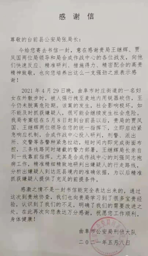 为了感谢台前警方快速反应、措施得力,短时间内成功锁定持刀犯罪嫌疑人,及时消除社会隐患。山东曲阜警方因此专门给台前县公安局张建国局长写了一封《感谢信》,于是就出现了开头的一幕。