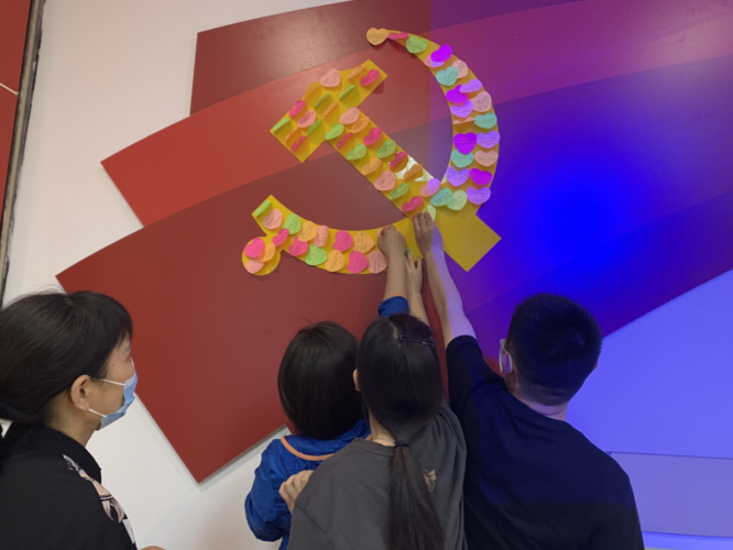 随后,社区党总支以“观影学党史”为契机,给每名参与活动的党员群众发放了便签纸,号召大家认真书写爱党情怀,积极表达对建党100周年的美好祝愿。“行远自迩,踔厉奋发;百年伟业,百年奋斗”、“守初心、担使命,在党的光辉下,谱写美好生活”······大家共同将手中写好寄语的便签纸在党员之家墙面上贴出了“党徽”的图案,用无声的行动,向中国共产党献上最美的礼物。