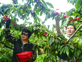 5月12日,在位于郏县长桥镇东长桥村的平顶山市绿禾农业汝河湾富硒生态园里,游客们正在采摘富硒樱桃。